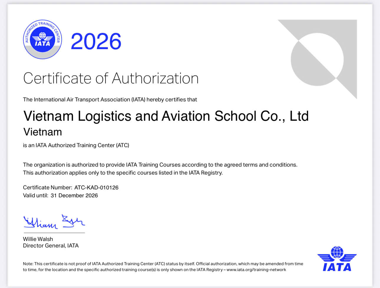 VILAS được IATA công nhận là IATA Authorized Training Center (ATC) tại Việt Nam. Công nhận này khẳng định năng lực của VILAS trong việc triển khai các khóa đào tạo theo chuẩn IATA với quy trình và chất lượng được chuẩn hóa, giúp học viên đáp ứng yêu cầu nghiệp vụ, an toàn và năng lực vận hành theo thông lệ quốc tế trong lĩnh vực hàng không – sân bay – logistics.